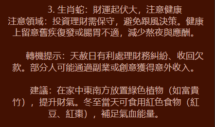 A:你此生將享有富貴長壽之福,這份福祉不僅惠及自身,更將傳承給你的子孫後代。你所經歷的種種艱難與坎坷,皆將在後半生化作滿滿的福氣。或許現在的生活已有所改善,但真正的幸福還在後頭。你命中註定的財運如同東昇的旭日,日益旺盛,尤其是下半生,更大的財富正向你走來。只要你能堅守本心,這份福祉必將屬於你。