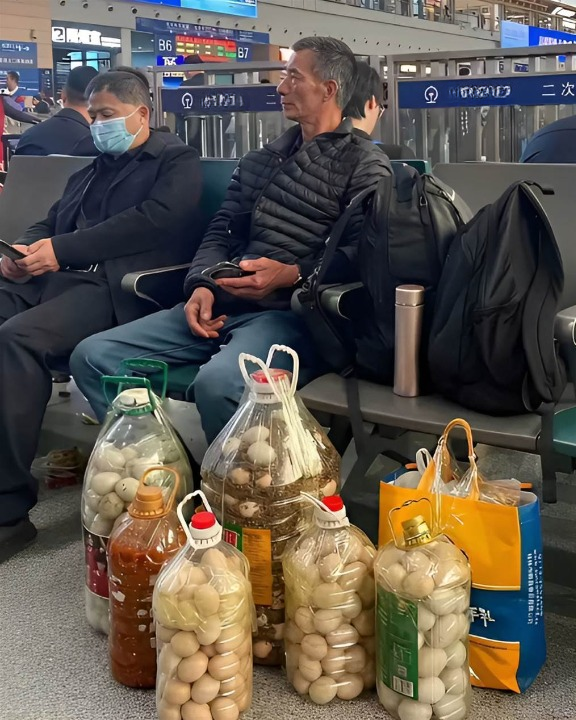 候車區附近,一位頭髮花白的大爺守著幾個藍色大桶,桶身上印著「只做優質坤沙醬酒」字樣。最引人注目的是,每個桶裡都滿滿當當地裝著雞蛋,桶口卻僅容一隻手透過。我盯著那些桶,怎麼也想不明白:這麼小的桶口,是如何把那麼多雞蛋裝進去的?