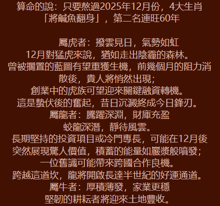 2026 財富預測: 你的財運來自「人脈財」。明年你不需要太辛苦,財富會透過「合作」或「介紹」自動上門。你那種**「不爭而獲」**的特質,會讓你在 2026 年底積累出一筆可觀的跨年私房錢。