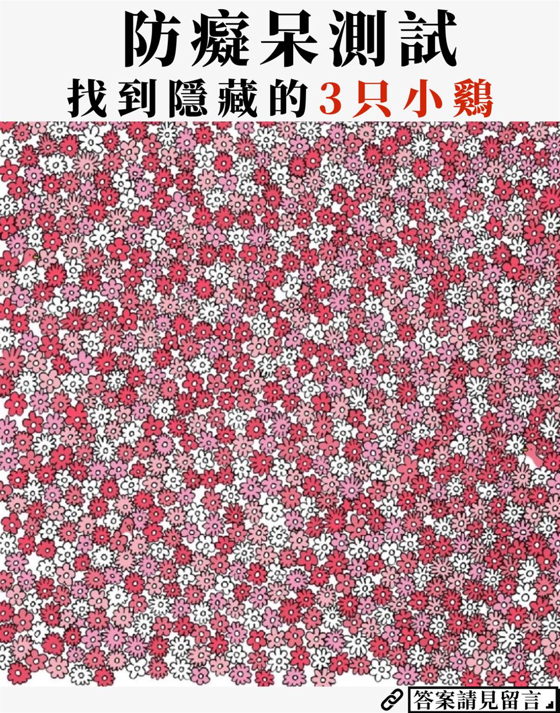 刷到個「防癡呆測試」,說要在滿屏花里找3只小雞。我想著自己眼神不差,點開圖就開找,結果這花密密麻麻的,紅的粉的白的,看得我眼都花了,跟小時候玩「大家來找茬」似的,越找越迷糊。