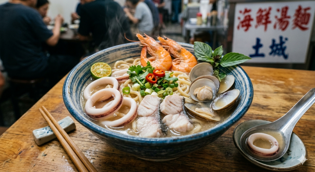 A. 一碗冒著熱氣、配料豐富的「海鮮湯麵」