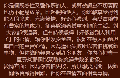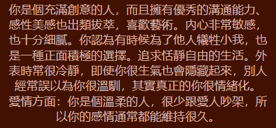 天生性格: 妳內心柔軟且極富包容力,比起自己發光發熱,妳更在乎身邊的人是否安好。妳是天生的「情感連結者」,大家在妳身邊都會感到安心。