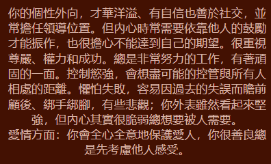 天生性格: 妳懂得愛自己,追求生活的質感與細節。妳散發出一種迷人的氣場,讓人不自覺想靠近妳,妳的魅力就是妳最強的武器。