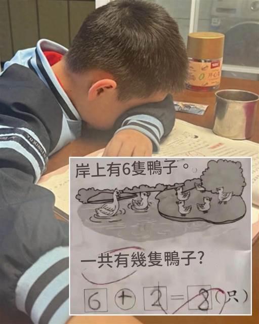 一位媽媽最近在社交媒體上分享了自己的尷尬經歷:她的兒子做了一道題:岸上有6隻鴨子,水中有兩隻鴨子,那麼總共有幾隻鴨子?孩子寫下「6+2=8」,結果被老師打了個大紅叉。