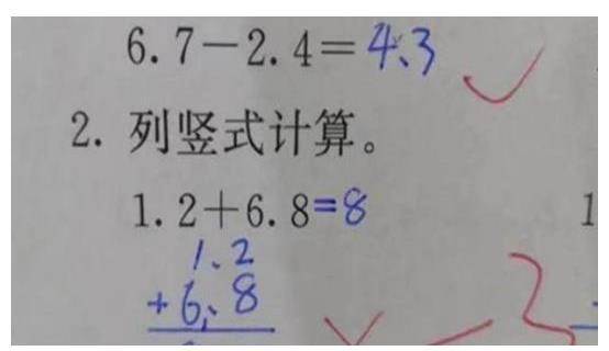 網上就有網友曬出了這麼一張照片,自家還在讀小學的孩子,在一次考試中,孩子在算「1.2+6.8」的時候寫了8,但是卻被打叉。孩子回來問家長,家長也感到百思不得其解,于是就和老師提出了質疑。