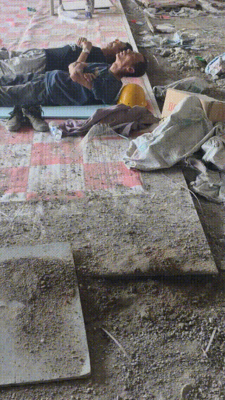 視訊中,一名工地工人似乎在短暫休息,他蜷縮的姿勢和地上的硬質材料都透露出生活的辛苦與艱難。那一頂黃色安全帽成了他午間略顯奢侈的枕備。視訊給人的震撼與疑惑不斷衝擊著我的心:這位工人的生活究竟是被什麼壓迫?