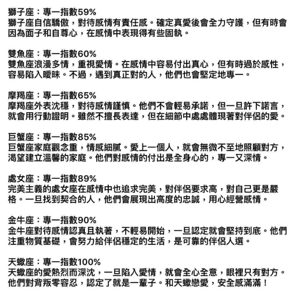 在乎感受、愛好和平,老婆說什麼幾乎言聽計從。儘管偶爾選擇困難,但對另一半絕對貼心又浪漫。