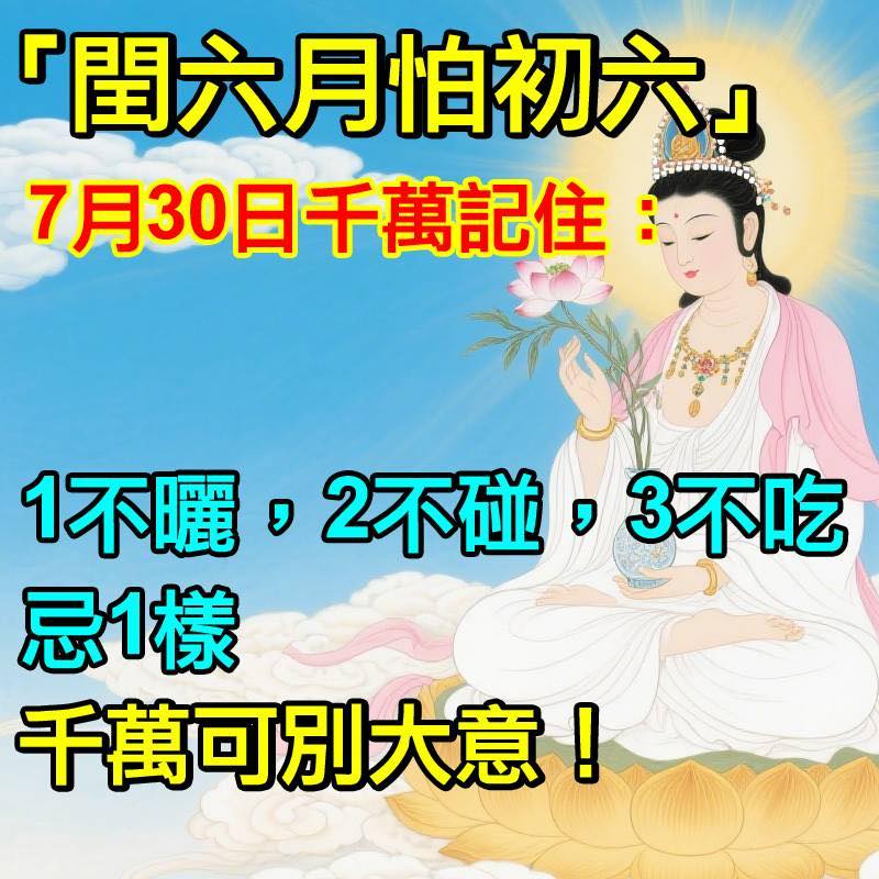 老一輩甚至流傳一句話:「閏六月,怕初六」,代表這一天氣場特殊、陰陽不穩,是民間相當忌諱的一日。今天西曆是 7月30日,剛好就是這一天,無論你信不信風水,都值得留意以下這幾件事: