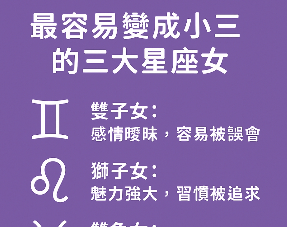 在愛情世界裡,有些人總是不小心走進別人的感情線,成為第三者。其實,她們並非天生想當「小三」,而是因為個性、魅力與情感模式,讓她們更容易被捲入曖昧與三角戀。以下三大星座女,就是最容易誤入小三角色的代表。