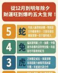 財運表現: 橫財、正財都旺盛,適合進行大規模投資、合作或拓展業務。財源滾滾而來,是把握年底最大財富機遇的生肖。