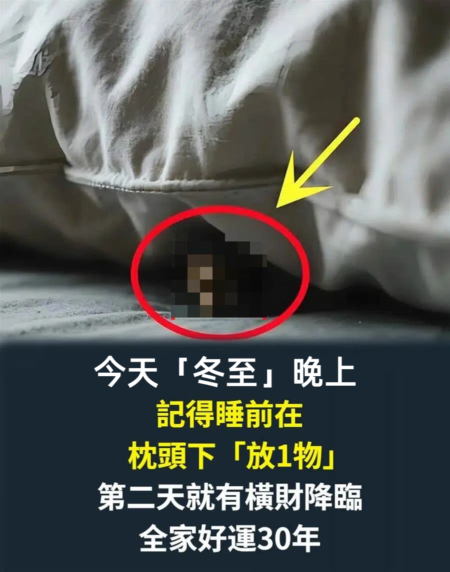 冬至的晚上記得在枕頭下面,放9枚硬幣。這是我聽90多歲的鄰居奶奶說的。