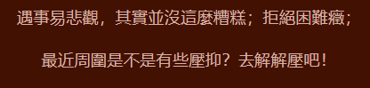 你很懂得有錢才可以過上好日子、生活才能更有質感的道理,所以在生活上你拼了命地想要賺很多,以致於難以去想別的事情,無法分心真的好好過日子,連未來也無法思考,更重要的是你應該先停下來,好好想一下自己的方向與腳步,才有機會賺更多的錢。